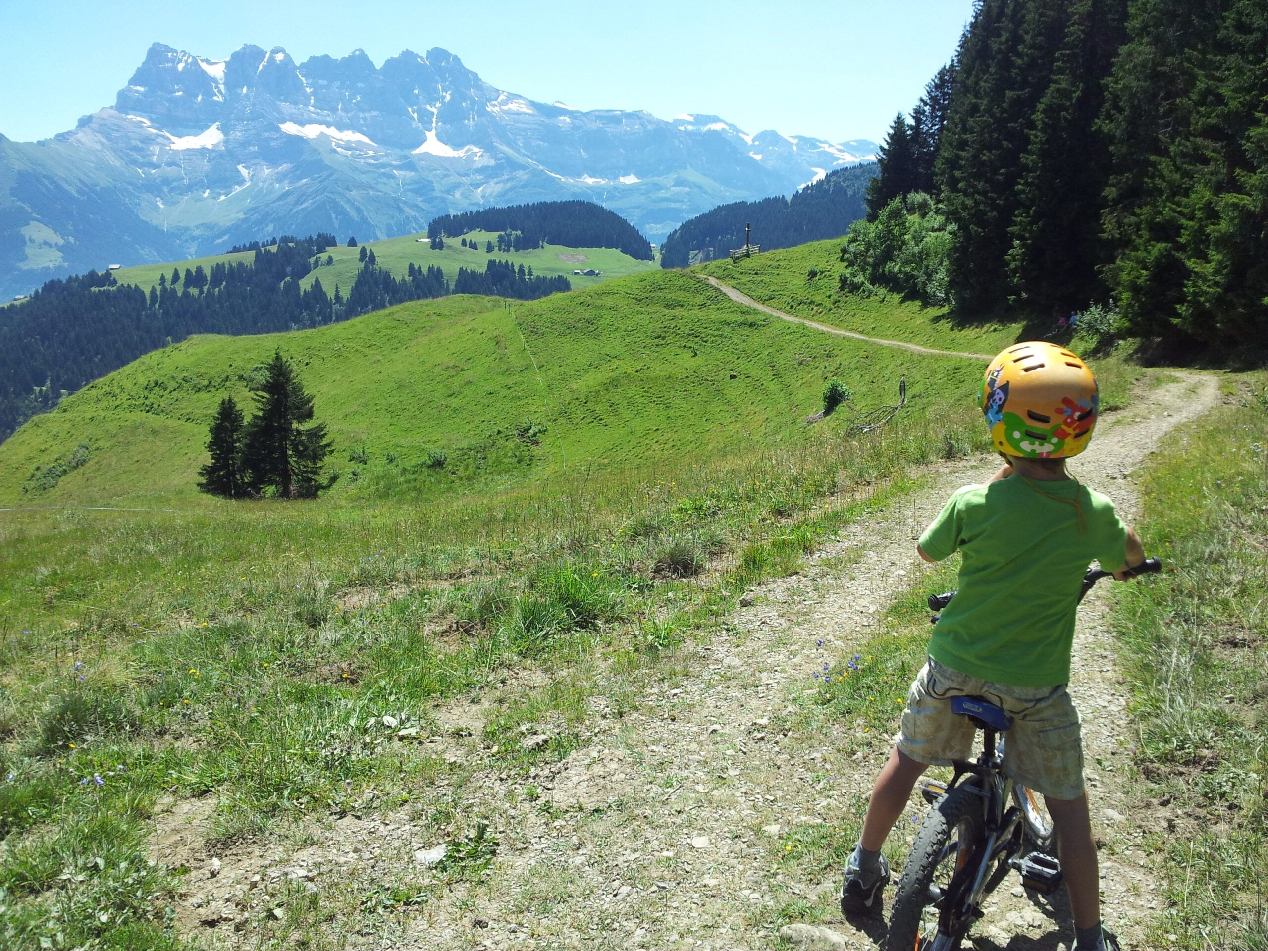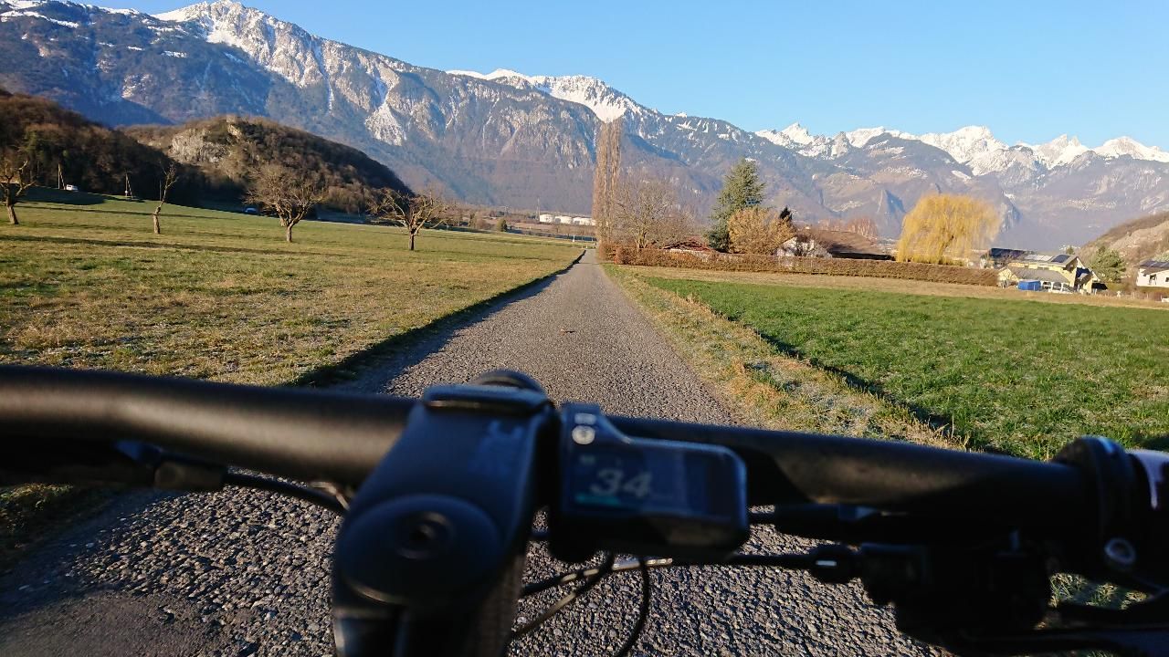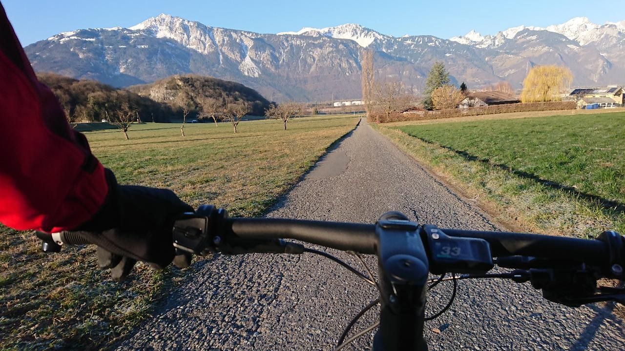 J’enfourche mon vélo, j’appuie sur les pédales, le moteur me pousse. Je pousse encore plus fort, j’accélère, et une sensation folle s’empare de moi: « youpie, je vole sur mon vélo ! » Je fonce sur cette petite route de campagne qui s’ouvre devant mes yeux. Comme chaque matin en partant de la maison, je remplis mon esprit de cette vue magnifique sur les montagnes enneigées. J’ai le sentiment que je ne pourrai sans doute jamais me lasser de ce beau paysage, de cette petite route, de cette intense sensation que procure le vélo en permettant d’aller si vite en poussant simplement sur des pédales.