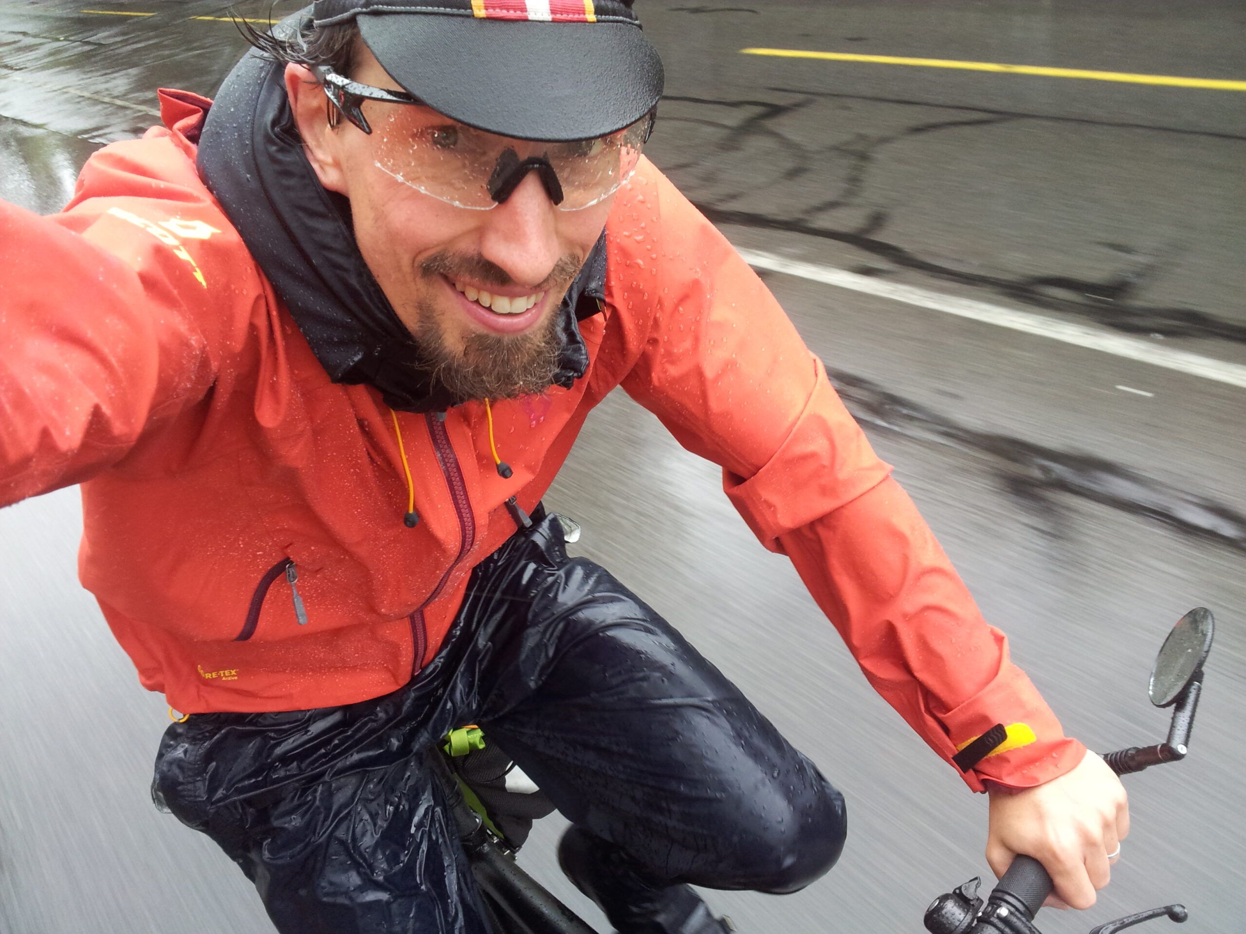 Les kilomètres s’enchainèrent et bien sûr cette sensation de bonheur s’estompa peu à peu, se noyant dans la pluie qui envahissait de plus en plus mon espace de confort. Au bout d’une vingtaine de minutes, elle disparut même totalement pour laisser place à l’incrédulité: comment était-ce possible de trouver du plaisir à rouler à vélo en étant tout mouillé? Ce revirement de sensation me surprit presque autant que celui qui suivit, car après une autre dizaine de minutes à me demander ce que je faisais là, je fus surpris de trouver la réponse à ma question! J’étais simplement un être humain qui a fait le choix de se rendre au travail à vélo, quelle que soit la météo, et ce matin j’avais la preuve que c’était possible. Mouillé pour mouillé, je pouvais maintenant dignement profiter de la liberté et de la chance de pouvoir être quotidiennement sur mon vélo. J’avais accepté qu’il pleuvait ce matin-là et j’avais enfourché mon vélo, j’étais resté moi-même, celui qui a du plaisir à rouler sur un vélo.