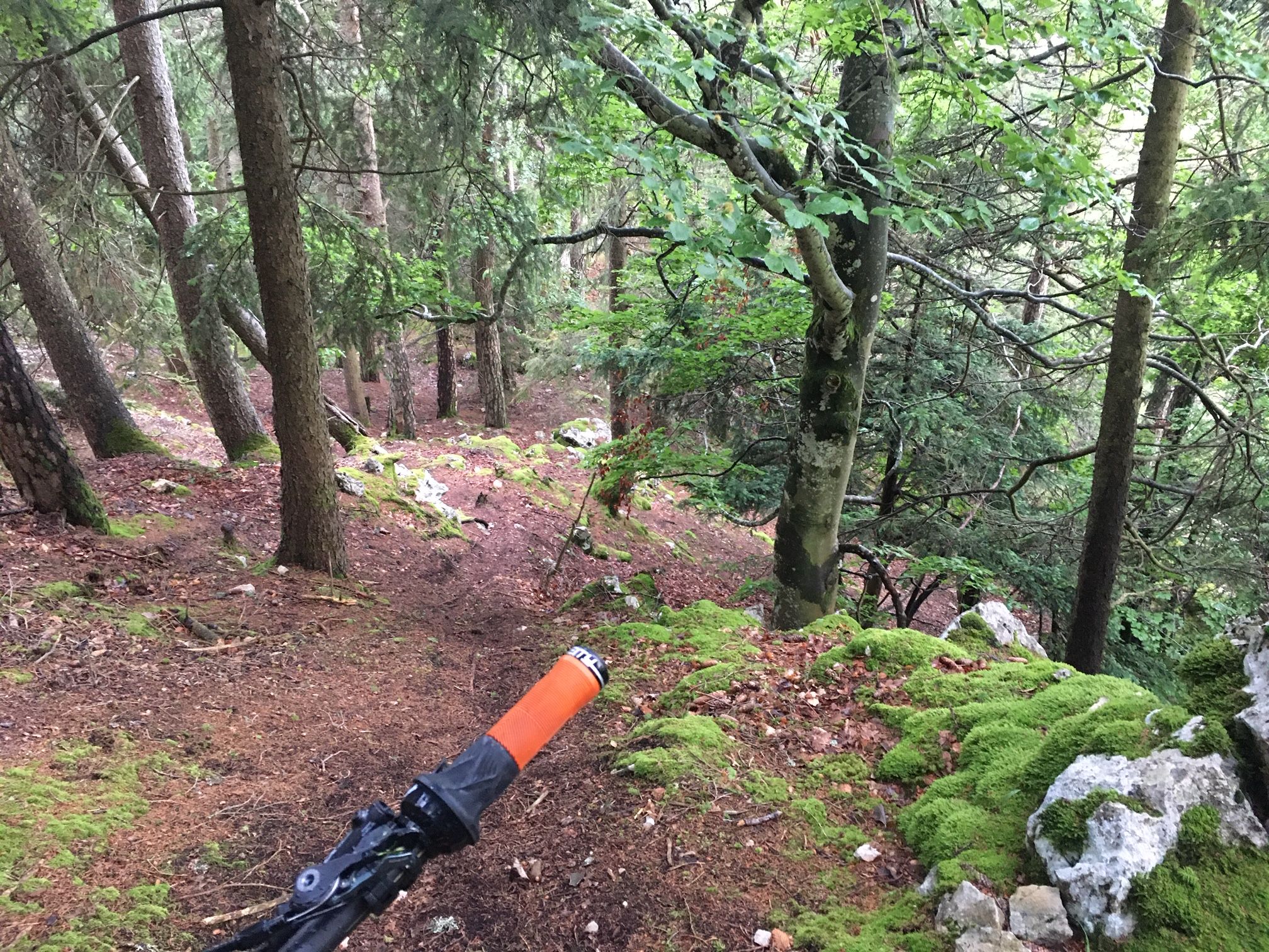 En ce milieu d’après-midi bien humide, je me suis donc dirigé vers les Aiguilles de Baulmes et le Suchet, jolies montagnes du Jura Vaudois dont les crêtes sont un rêve technique à rouler. Mais pas par temps humide…car la pente y est prononcée et le calcaire est omniprésent sur la partie haute. Je suis donc monté par les Gorges de Covatanne, profitant allègrement du couple du moteur électrique pour franchir la côte assez sévère par endroits, pour me diriger ensuite vers les single trails a priori les moins caillouteux de la zone.