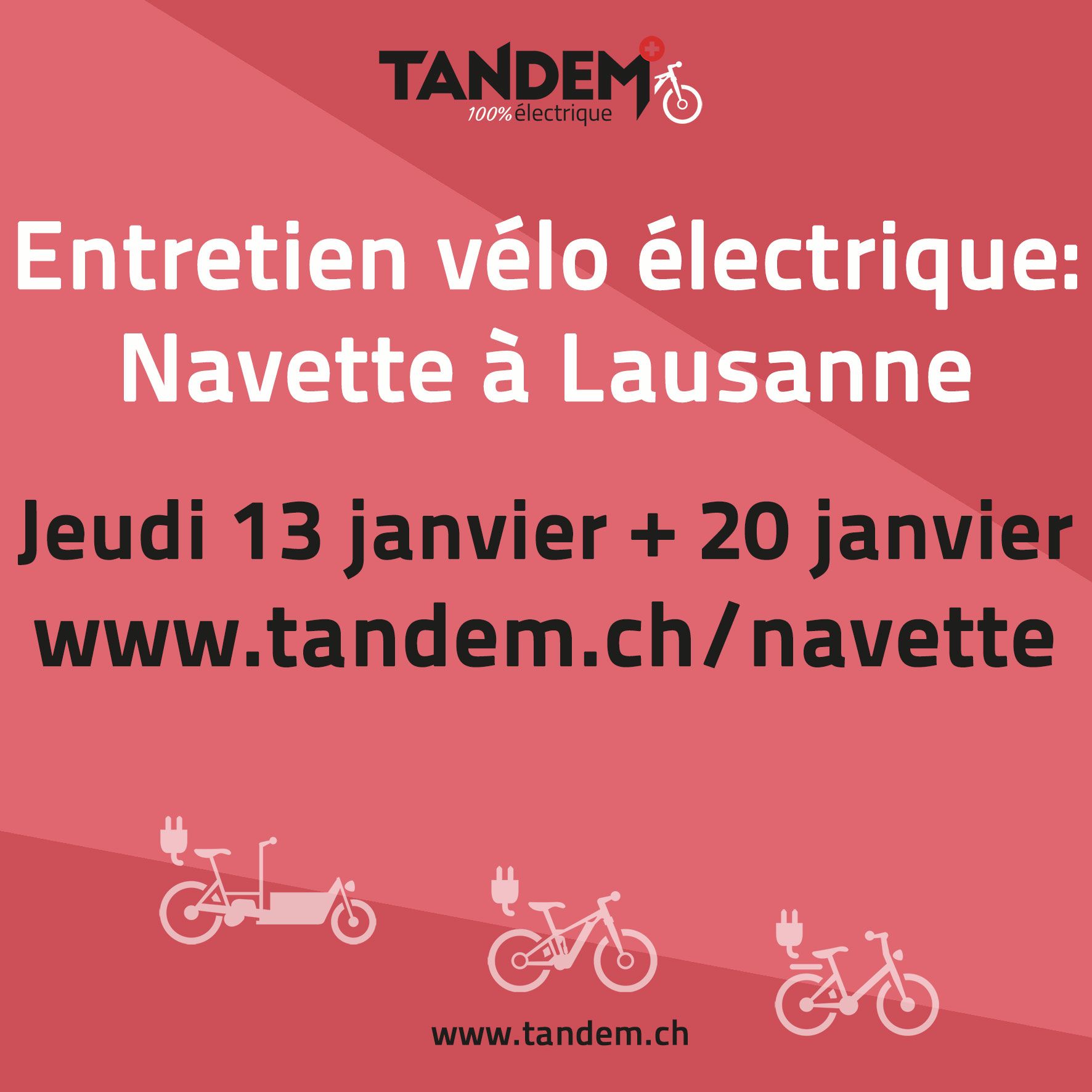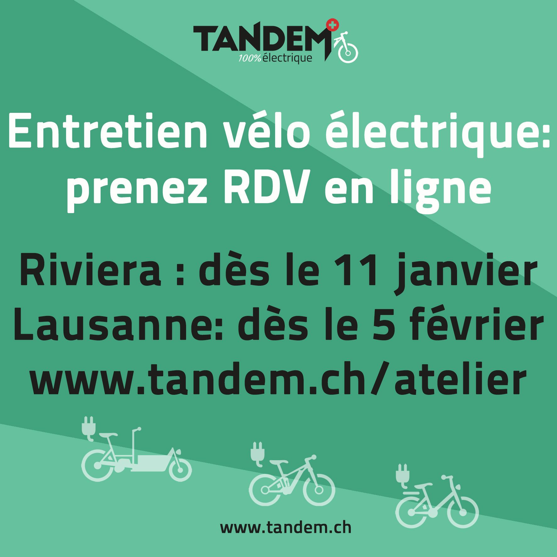 TANDEM vient chercher votre vélo électrique à Lausanne (transporteur offert!), l’entretien est fait à Riviera, et votre vélo vous est ramené le jeudi suivant à la même adresse.